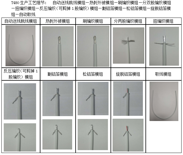 生產工藝細節: 自動送線裁線模組—熱剝外被模組—刷編織模組—分雙股編織模組—扭編織模組—反壓編織(可剪掉1股編織)模組—割鋁箔模組—松鋁箔模組—旋脫鋁箔模組—自動取線